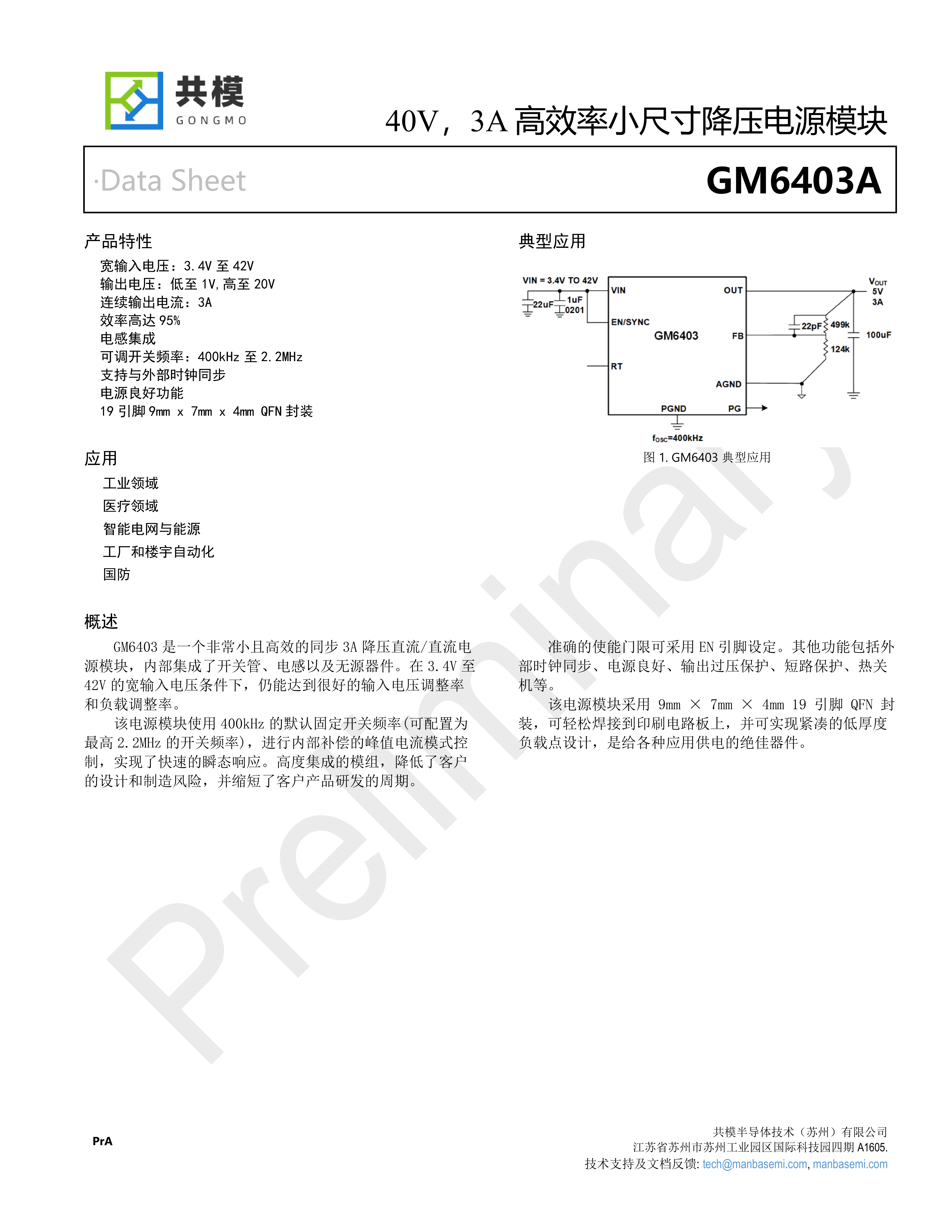 GM6403 是一个非常小且高效的同步 3A 降压直流/直流电 源模块,内部集成了开关管、电感以及无源器件