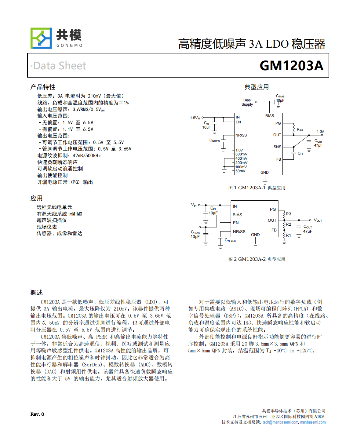 对于需要以低输入和低输出电压运行的数字负载(例如专用集成电路(ASIC)、现场可编程门阵列(FPGA)和数字信号处理器(DSP)),GM1203A所具备的高精度(在线路、负载和温度范围内可达1%)、快速瞬态响应性能和软启动能力可确保实现出色的系统性能。外部使能控制和电源良好指示功能够更容易的进行时序控制。GM1203A采用20脚3.5mm×3.5mm QFN和5mm×5mm QFN封装,结温范围为TJ=-40°C to+125°C。