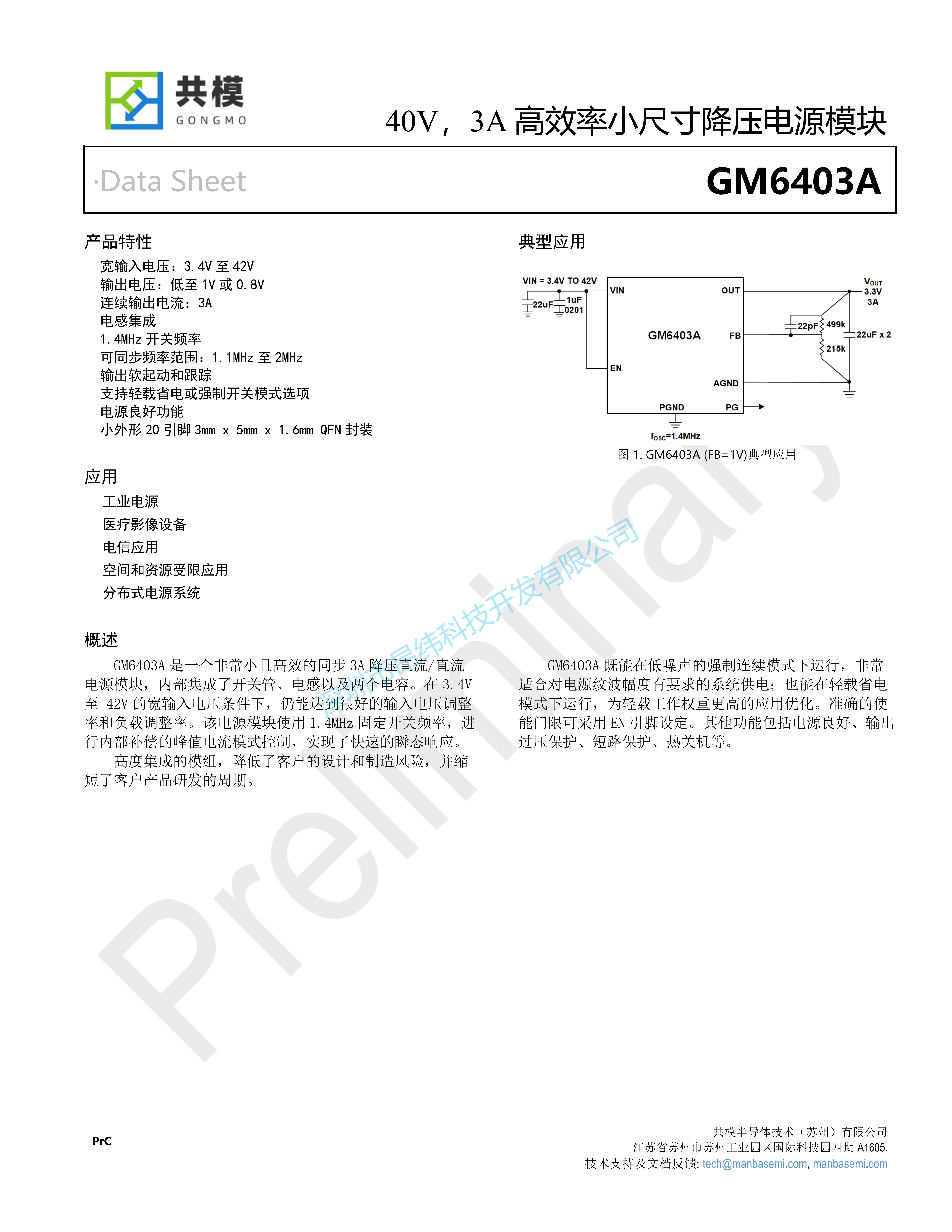 GM6403A是一款高度集成的降压模块,采用峰值电流模式控制和1.4MHz固定开关频率,实现快速瞬态响应和高效率。其核心优势包括: